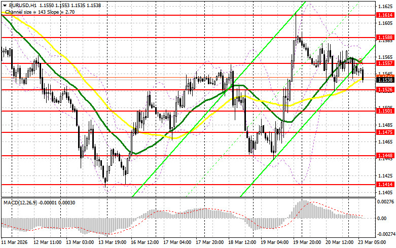 Шансы на наземную военную операцию США в Иране могут привести к очередной распродаже рисковых активов и укреплению доллара. Из данных сегодня ожидается лишь индикатор потребительской уверенности еврозоны за март этого года. Плохие показатели могут быстро вернуть давление на евро. В этом случае первого проявления покупателей буду ждать в районе новой поддержки 1.1526. Формирование там ложного пробоя даст точку входа в длинные позиции с целью восстановления пары к уровню 1.1557, образованному по итогам сегодняшнего дня. Прорыв и обратный тест этого диапазона станут подтверждением правильных действий на покупку евро уже в расчете на более сильный рывок к сопротивлению 1.1588, где ожидаю активного проявления продавцов. Самой дальней целью выступит максимум 1.1614, где буду фиксировать прибыль. При варианте снижения EUR/USD и отсутствия активности в районе 1.1526, давление на евро сильно возрастет. В таком случае продавцы попытаются дотянуться до следующего интересного уровня 1.1501. Лишь формирование там ложного пробоя будет подходящим условием на покупку евро. Открывать длинные позиции сразу на отскок будут от 1.1475 с целью восходящей коррекции в 30-35 пунктов внутри дня.