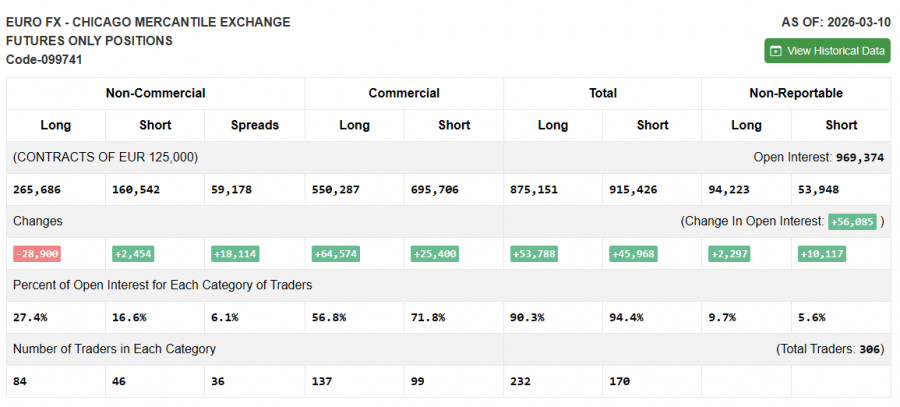 В COT-отчете (Commitment of Traders) за 10 марта наблюдалось сокращение длинных позиций и рост коротких. Учитывая продолжающуюся войну США и Израиля с Ираном, нет ничего удивительно, что в этом отчете вновь зафиксирован резкий рост коротких позиций по евро. Ситуация на Ближнем Востоке пока не приходит в норму, так что рассчитывать на кардинальные изменения в расстановке сил пока не приходится. В COT-отчете указано, что длинные некоммерческие позиции снизились на 28 900 до уровня 265 686, в то время как короткие некоммерческие позиции выросли на 2 454 до уровня 160 542. В результате спрэд между длинными и короткими позициями вырос на 18 114.